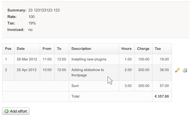 To illustrate the use of MetaData, an example wiki application is shipped with MetaDataPlugin. The TimeTracker application may be used to track working efforts and compute resulting earnings based on standard rates and taxes. The application allows to create new TimeTracker topics which have a database of efforts recorded on that tracker.