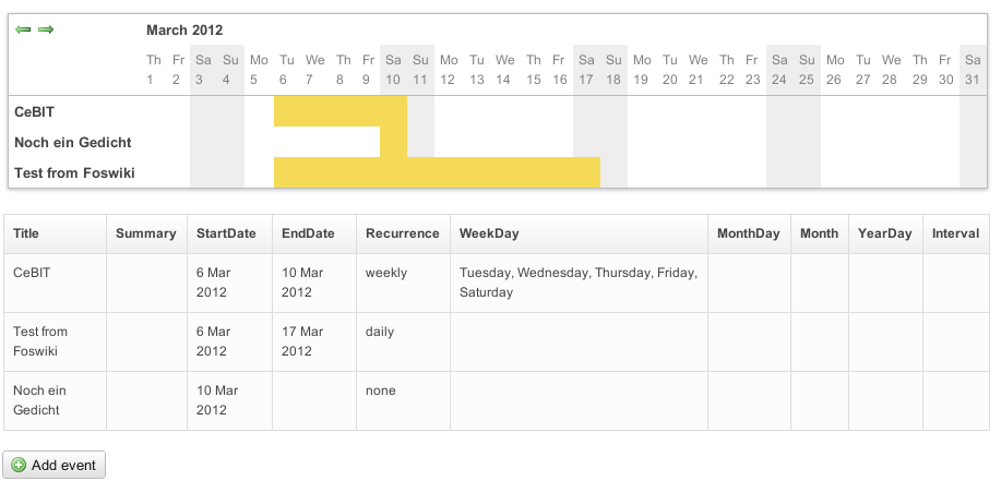 Below screenshot 3 shows an integration with Foswiki:Extensions/HolidaylistPlugin and Foswiki:Extensions/ICalPlugin to render a ical driven resource view where all events are stored in %META:EVENT{}% records.