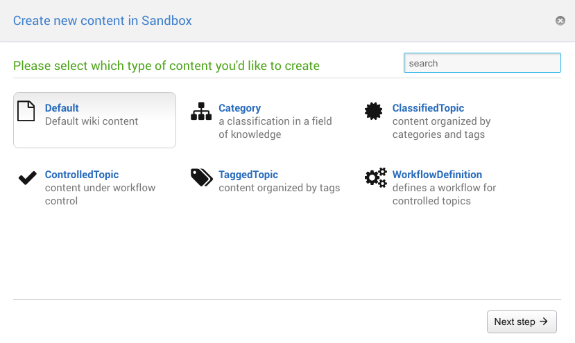 In the first example there are 5 TopicTypes deployed to the Sandbox web "Category", "Classified Topic", "Controlled Topic", "Tagged Topic" and "Workflow Definition" that you can choose from in a first step